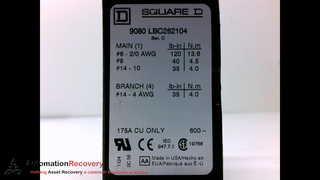 - SQUARE D 9080-LBC262104, POWERS DISTRIBUTION BLOCK, 600V, 175A,